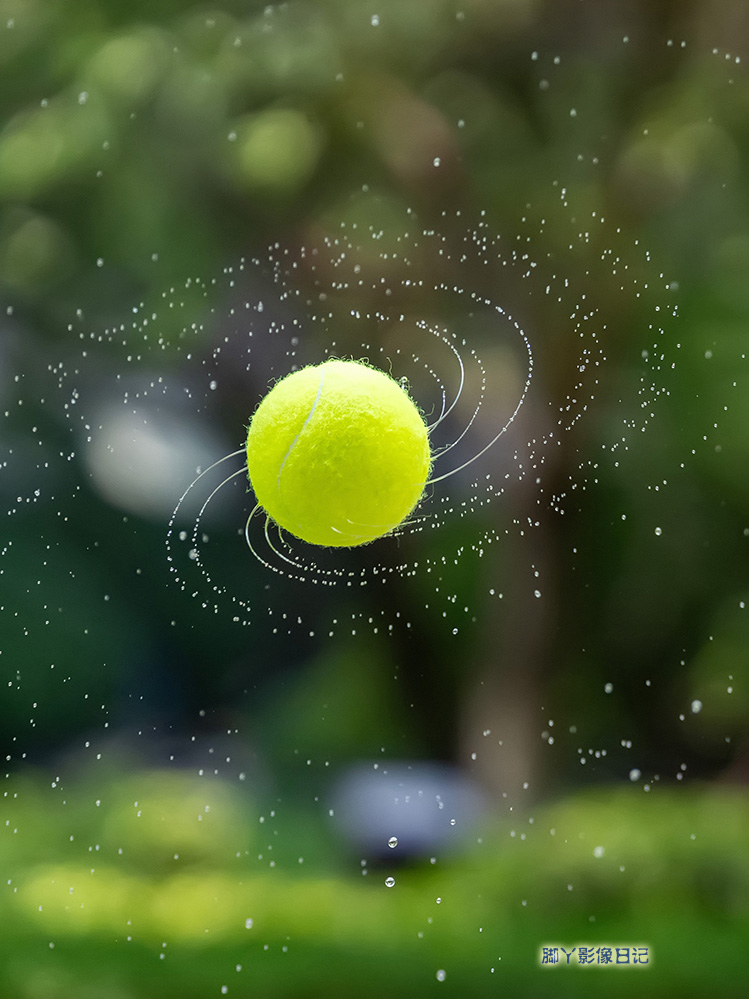 这张照片以极高的快门速度定格了一颗湿漉漉的网球在空中高速旋转时甩出水珠的瞬间。画面中,鲜亮的黄色网球悬浮于绿意盎然的背景之上,周围环绕着一圈圈细密而有序的水滴轨迹,宛如行星绕日运行的轨道,又似宇宙星云般充满动感与诗意。这些水滴并非杂乱飞溅,而是呈现出清晰的螺旋状分布,生动展现了物体旋转运动中的物理规律。