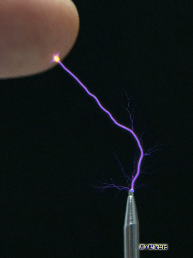 此外,照片中电弧呈现紫色,是因为在空气中,高电压激发了氮气和氧气分子,使其发出特定波长的光——其中氮气主要发射紫蓝色光,因而整体呈现出梦幻般的色彩。电弧的分叉形态也反映了电离路径的不稳定性,如同自然界中闪电的分支结构,只是规模缩小了无数倍。