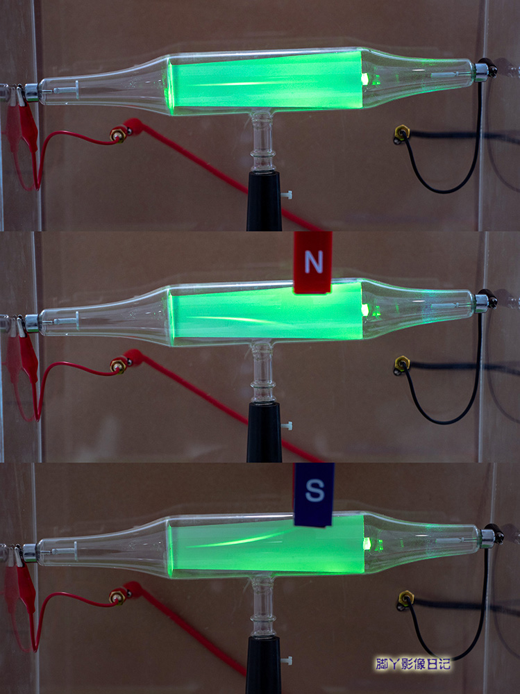 这张照片由三幅图像拼接而成,生动地展示了在不同磁场条件下,阴极射线在真空管中运动轨迹的变化。画面中,一个玻璃阴极射线管内部发出明亮的绿色荧光,其路径原本是一条笔直的光束;当外加磁场后,光束发生明显偏转,且偏转方向随磁极位置改变而变化——上方为无磁场状态下的直线轨迹,中间和下方分别显示了磁铁N极与S极靠近时,射线向不同方向弯曲的景象。这组照片不仅具有强烈的视觉对比,更深刻揭示了电磁学中带电粒子在磁场中受力的基本规律。